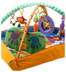 Так же есть второй режим работы - 15 мин. звучит приятная музыка Моцарта. Для работы музыкального центра нужны 3 батарейки "АА" (в комплект не входят). Развивать малышу тактильное восприятие и навыки мелкой моторики помогут 3D-активные фрагменты картинок, размещенные на коврике: здесь есть белочка с шуршащим хвостом, хрустящее солнышко, закрывающее птичку, и воздушный змей, за которым спрятались пчелки, жираф с бархатистой и шелестящей шеей, мышку можно потянуть за хвостик - он растянется, в одной из овечек секрет - пищалка. Игровой коврик «Стукни и играй» имеет трехмерно-пространственную форму с округлыми пересекающимися арками, а бортики коврика можно поднять и закрепить при помощи кнопок. «Эффект арок» помогает расслабиться крохе, обеспечивая визуально безопасное пространство - это напоминает малышу о пребывании в уютном мамином животе. Разглядывая себя в зеркале, малыш «разговаривает» с отражением, лепечет, осваивает смысловое значение произносимых звуков. Малыш не теряет уверенности в собственной безопасности и при этом развлекается, слушая нежную музыку и разглядывая, висящие над ним веселые красочные игрушки, которые словно приглашают достать себя, потрогать, схватить и подтянуть к себе поближе. Малыш, играя, тренирует кисти рук, их силу и ловкость. Лежа на животике, малыш стремится поднимать голову и плечи, чтобы видеть игрушки, картинки и зеркало. Он хочет взять игрушку - и переносит вес тела на одну руку. Такая «тренировка» поможет ему быстрее научиться ползать. Все это позволяет стать нашему коврику «особенным» местом для ребенка. Кроме того Игровой коврик «Стукни и играй»(«Kick&Play;») предлагает множество возможностей познавать причину и следствие произведенных действий: трогаем висящую игрушку - она раскачивается, стучим по музыкальной панели центра – и можем наблюдать за вспыхивающими огоньками, слушать музыку. Когда ваш малыш подрастет, можно дать ему больше свободы – опустите бортики, арки тоже можно убрать. Теперь наш коврик - полноценная игровая площадка и привычное место для вашего крохи. Для всех малышей важна спокойная и привычная обстановка: идя в гости, возьмите игровой коврик с собой, он очень легкий и компактный. Коврик мягконабивной, ткань – хлопок 100%. Краски безопасные, стойкие. Коврик можно стирать. Игровой комплекс легко собрать и разобрать. Размер коврика: 102х110 см. Высота арок 45 см. Производство Tiny Love (Израиль - Китай).